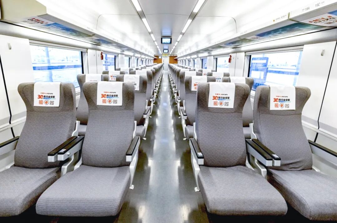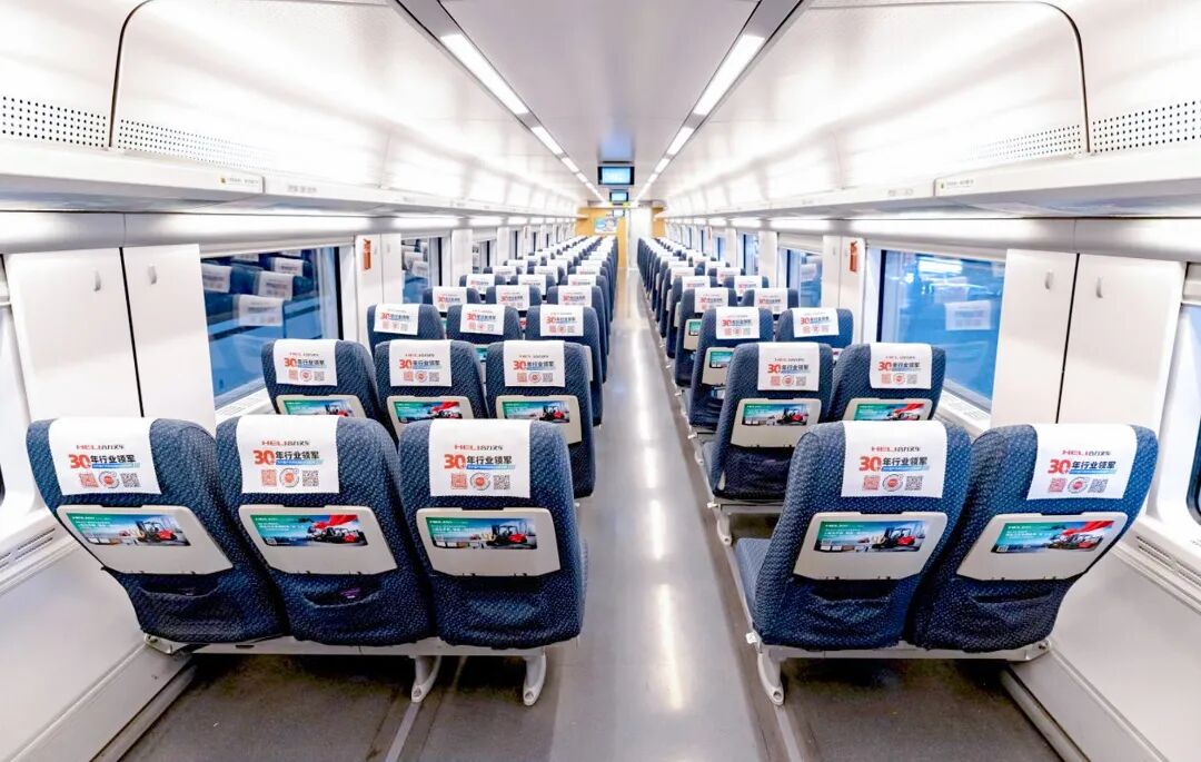 京廣線縱貫南北,隴海線橫跨東西,京滬線客流如織,滬漢蓉線串聯古今,京杭福線融匯人文與自然……列車穿梭不息,在運送旅客的同時也將合力叉車六十多年的專注與三十四載的連冠傳奇生動地呈現在億萬公眾面前。車廂內,頭片、桌貼、品牌天幕等視聽元素交織出沉浸式的品牌空間,讓“合力”成為可信賴的中國制造代名詞。
